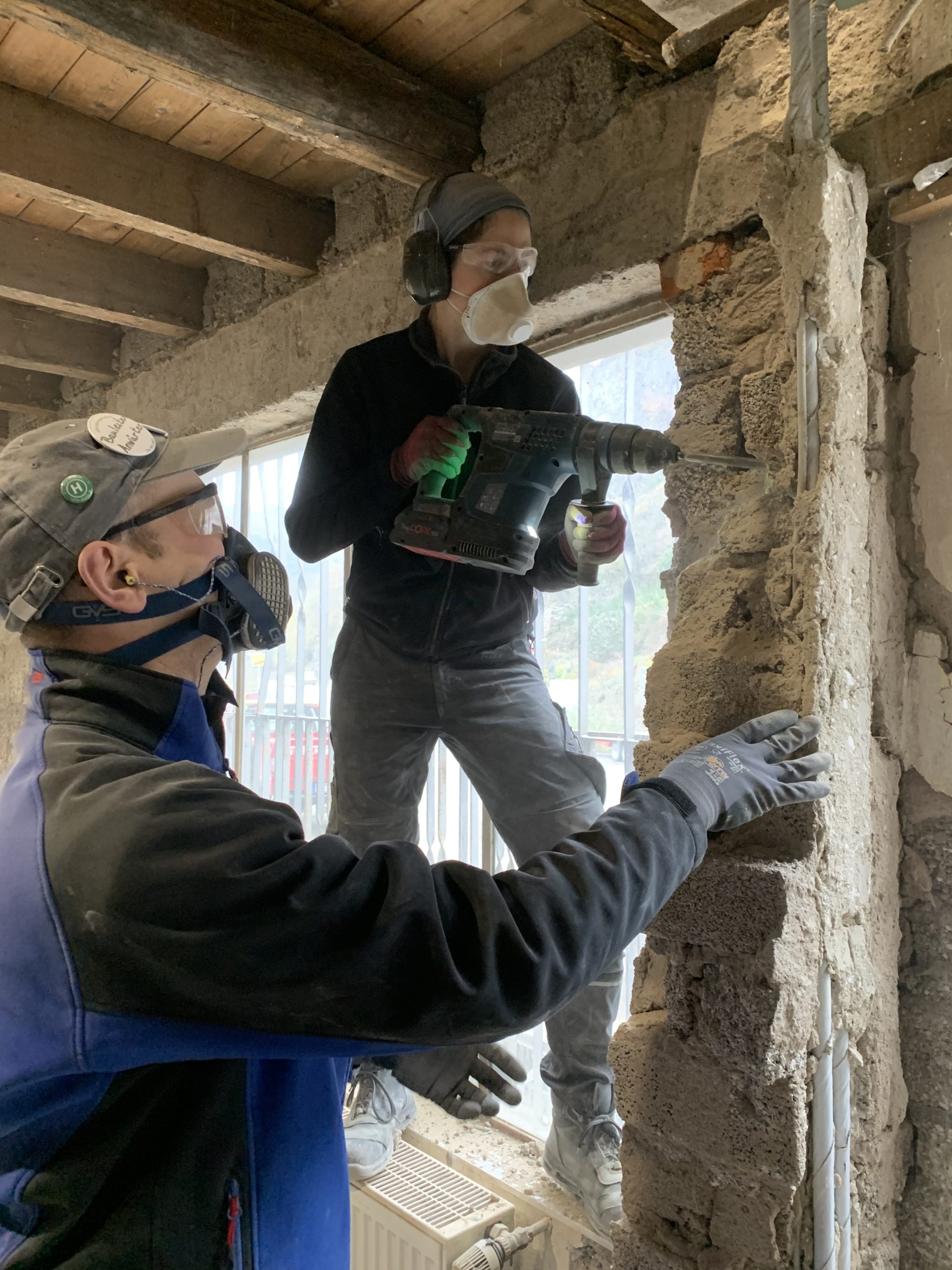 Zwei unserer engagierten Helferinnen halfen beim Isolieren und auch beim Strahlenschutz. Leider ist die betroffene Person aufgrund einer Krankheit so eingeschränkt, dass sie Handystrahlung nicht verträgt. Deshalb wurden Lehmziegel zusammen mit angerührtem Lehmputz an die zuvor abgestemmte Wände angebracht. Der Lehm wurde mit einem Akkuschrauber angerührt, da noch kein Strom vorhanden ist.