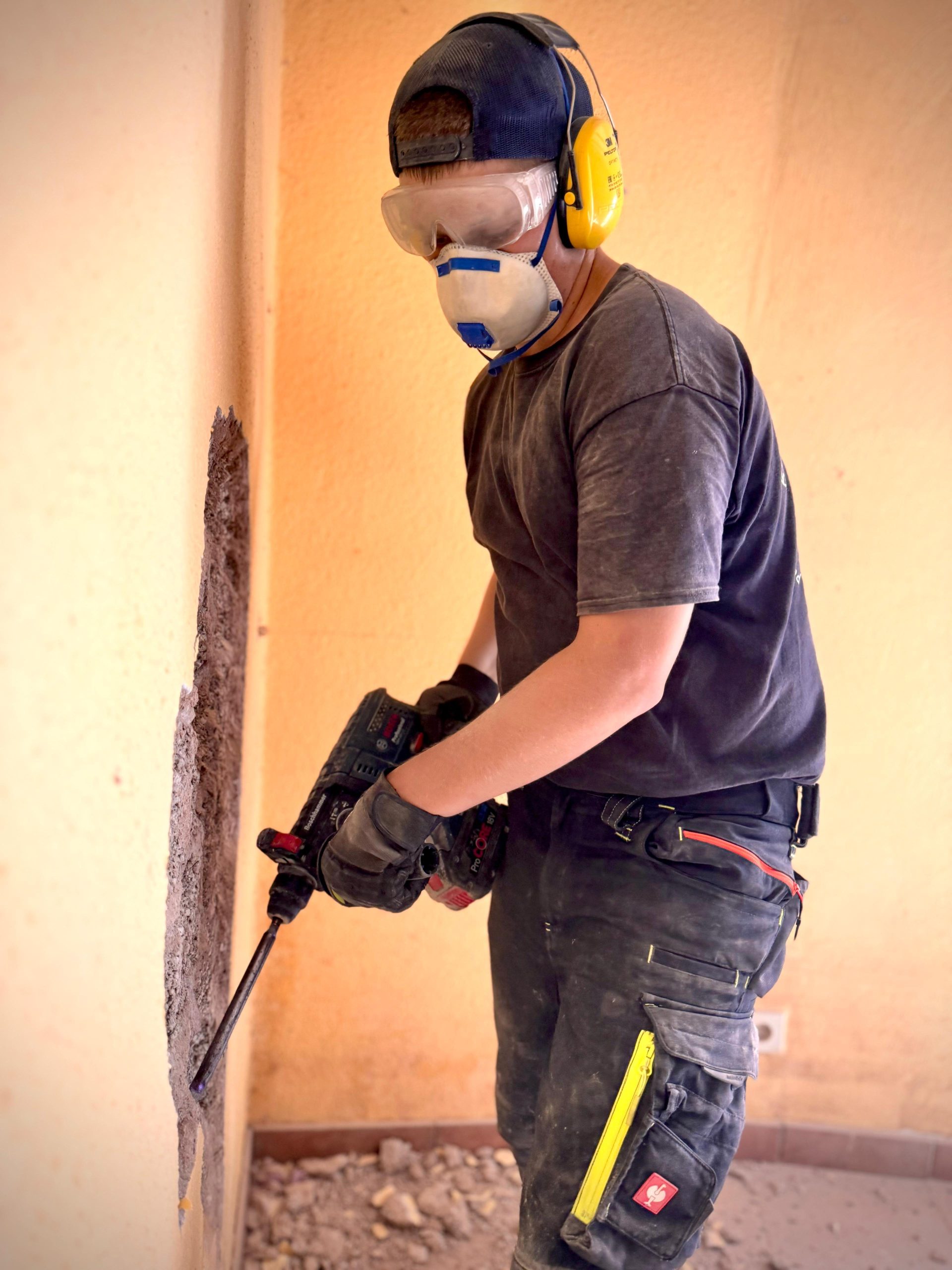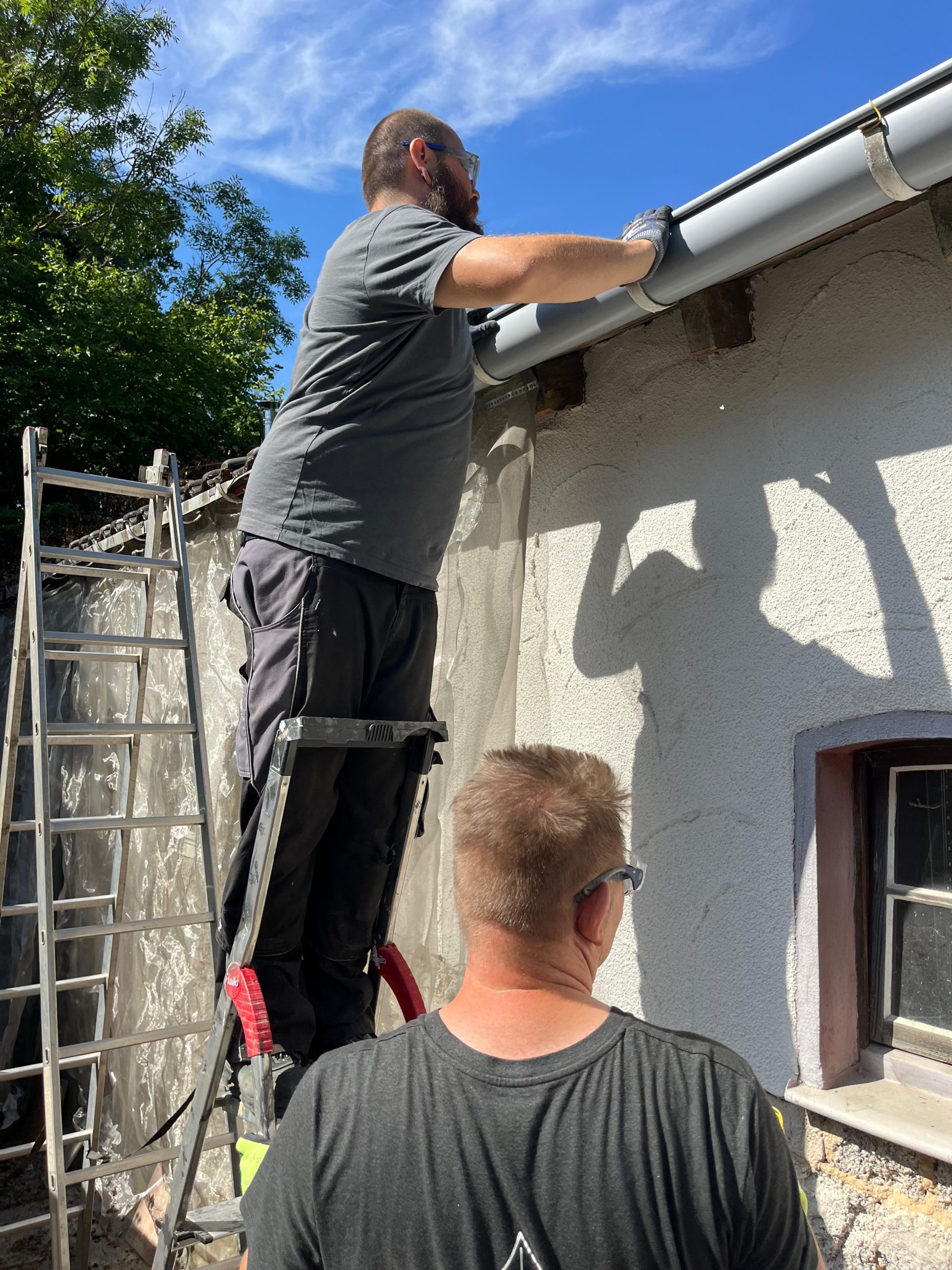 In Insul ging es vor allem um harte Stemmarbeiten: Fliesen, Putz und Estrich mussten weichen. Ob mit kleinem Bosch-Stemmgerät, großem Scheppach-Stemmhammer oder Vorschlaghammer: Hier wurde kräftig angepackt, um die Abrissvorbereitungen und Umstrukturierungen der Räume voranzubringen. Zum Glück muss nur ein kleiner Teil des Hauses abgerissen werden. An den bewohnten Bereichen erneuerten wir eine Dachrinne, damit das Haus künftig besser vor Wasserschäden geschützt ist.