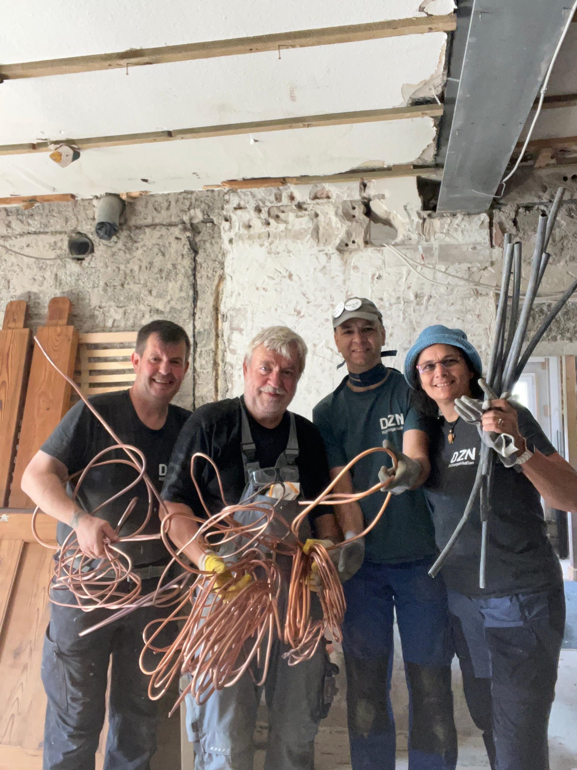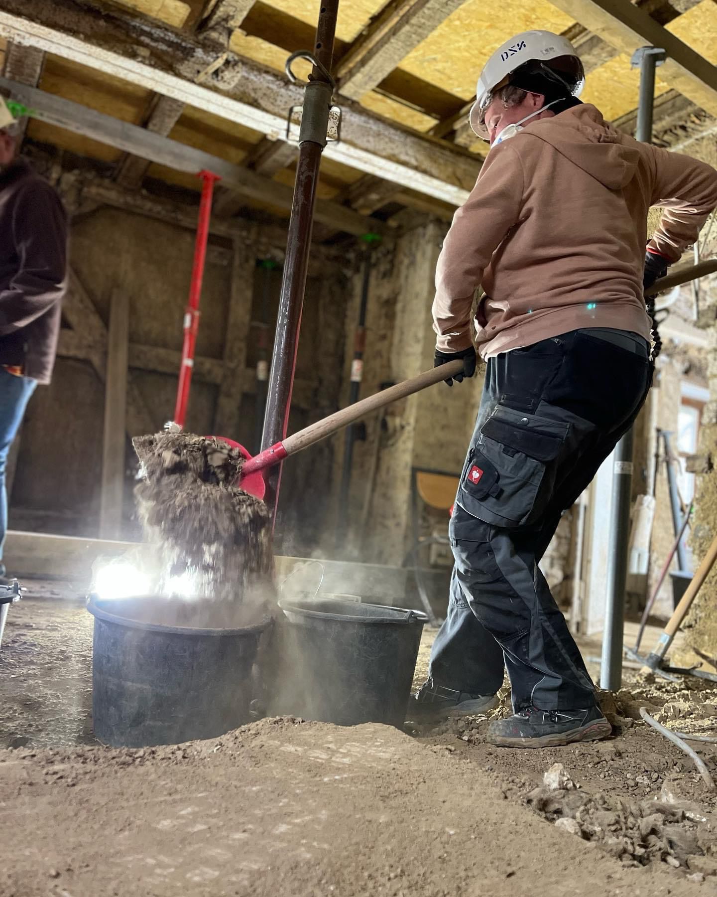 Es ist immer wieder besonders schön, bei unseren Einsätzen altbekannte Gesichter wiederzutreffen. Teilweise sind Freundschaften entstanden, die weit über den Hilfseinsatz hinaus gehen. In diesem Fachwerkhaus haben wir schon oft geholfen: Zunächst beim Rückbau, jetzt dürfen wir auch beim Wiederaufbau mit anpacken. Die Wände sollen mit einer Blähton-Mischung gedämmt werden. Dazu haben wir abschnittsweise Schalbretter angebracht und anschließend den angefeuchteten Blähton eingefüllt und festgestampft. Eine große Sauerei, aber auch ein riesiger Spaß!