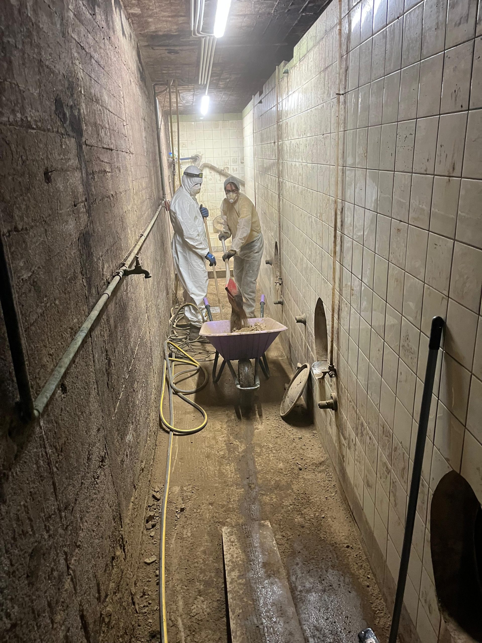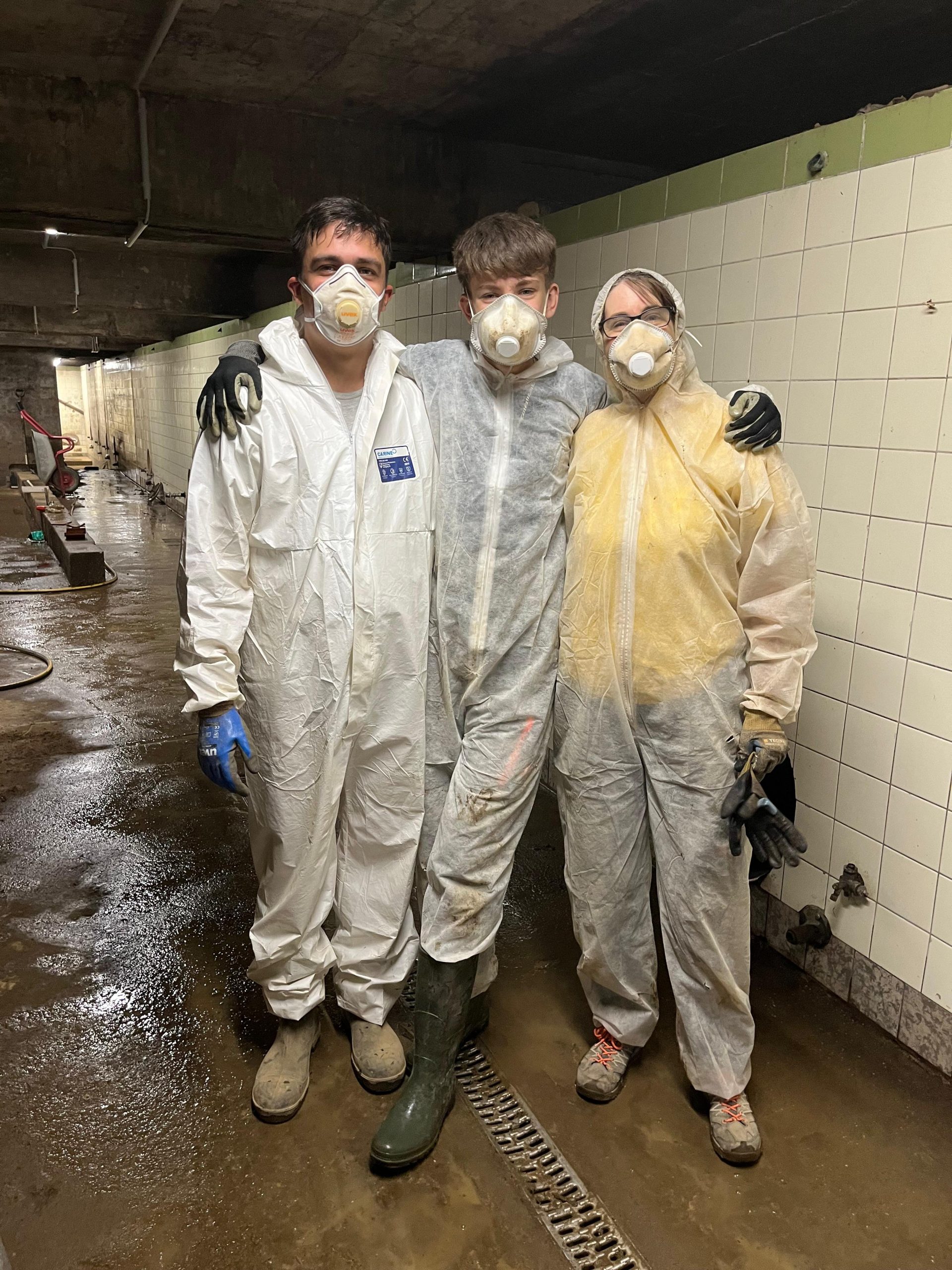 Bei einem Winzer, dessen Wohnhaus in Mayschoß ebenfalls schwer betroffen war, stand lange nicht fest, ob der Weinkeller überhaupt erhalten bleiben kann. Nun ist klar: Er bleibt bestehen! Also halfen wir dabei, den mittlerweile getrockneten Flutschlamm aus den „Fässern“ (hierbei handelt es sich nicht um die bekannten Holzfässer, sondern eine Art kleiner Raum) zu holen. Keine leichte Aufgabe. Die Kleinsten von uns passten gerade so hinein, um den Schlamm zunächst aufzuweichen und dann Stück für Stück herauszutragen (der „Eingang“ ist das kleine Loch, welches man rechts auf dem Bild sieht). Eine mühsame Arbeit, die sich für den Winzer und für uns mehr als gelohnt hat. Neben den Fässern haben wir natürlich auch den gesamten Weinkeller von Grund auf gereinigt.