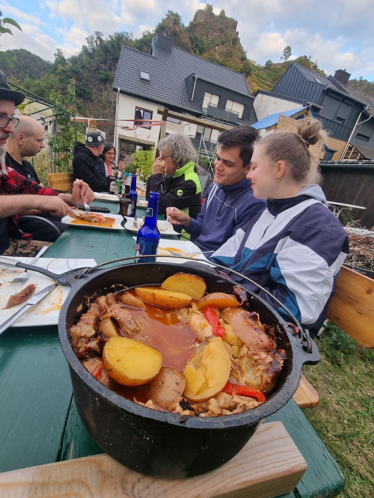 Auf den Baustellen wurden wir immer bestens versorgt. Abends gab’s meistens selbst gekochtes Essen: Rehgulasch von Jörg, frisch gebackene Pizza von Christian oder Steffis Schichtfleisch. Aber auch die Gastronomie der Region haben wir unterstützt, unter anderem bei Ali in der „Arya Grill Pizzeria“ in Schuld oder bei einem gemeinsamen Abend mit Team Dori in der „Klause zur Burgwiese“ in Mayschoß.