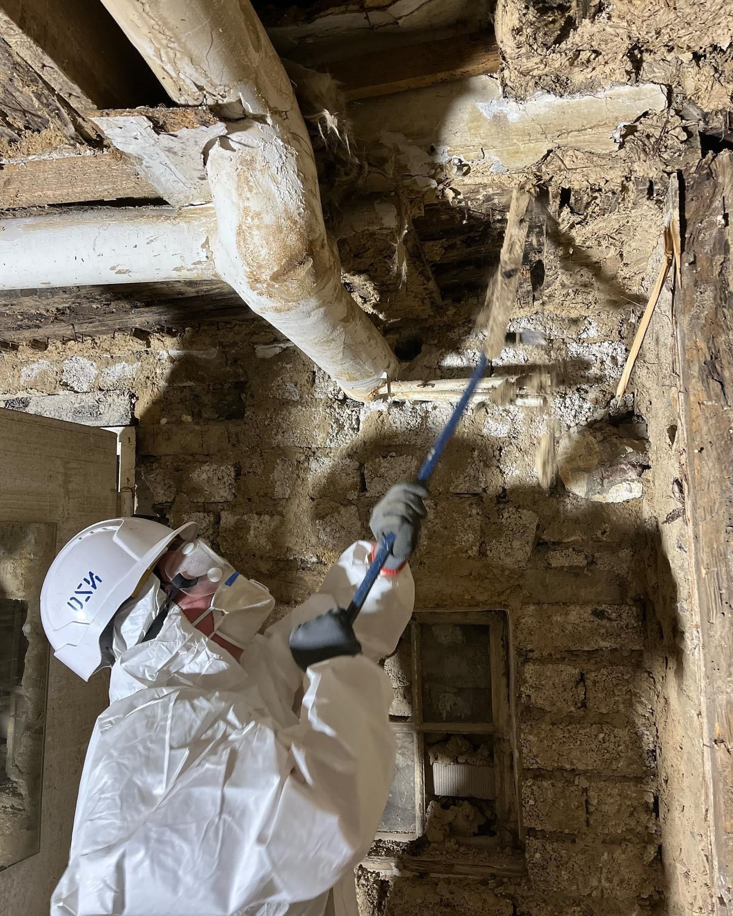 Der Keller stand hier komplett unter Wasser und die „verlorene Schalung“ (eine Holzschalung fürs Beton-Gießen, die dann aber eigentlich am Beton erhalten bleibt und ihn verdeckt) musste endlich entfernt werden, da sich dahinter Schimmel gebildet hatte. Mit Atemschutz gegen die Schimmelsporen machten wir uns gemeinsam ans Werk. Wer schon einmal stundenlang über Kopf gearbeitet hat weiß, wie sehr das den Körper belastet. Angenehm ist es nicht, doch was getan werden muss, packen wir an.